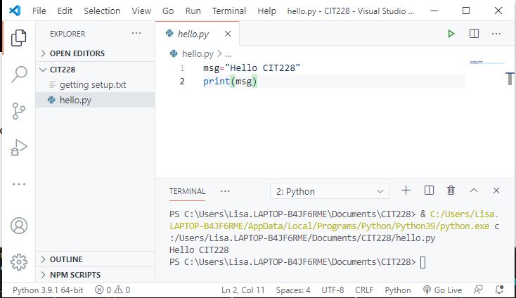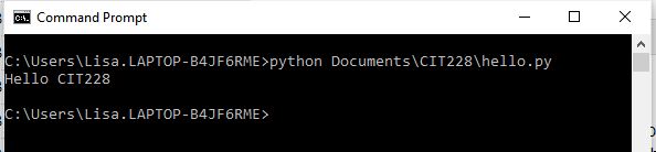 In the example below, the directory was changed to Documents and then it was changed to CIT228 which is where the program file is stored. The script was executed by entering Python hello.py (hello.py is the name of the file).