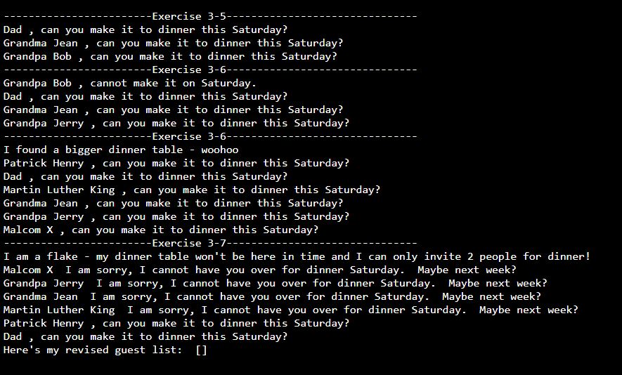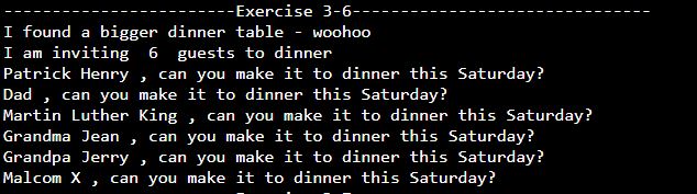 2. Complete exercise 3-9 on page 46. Add the len() function to exercise 3-6 which has the most guests.